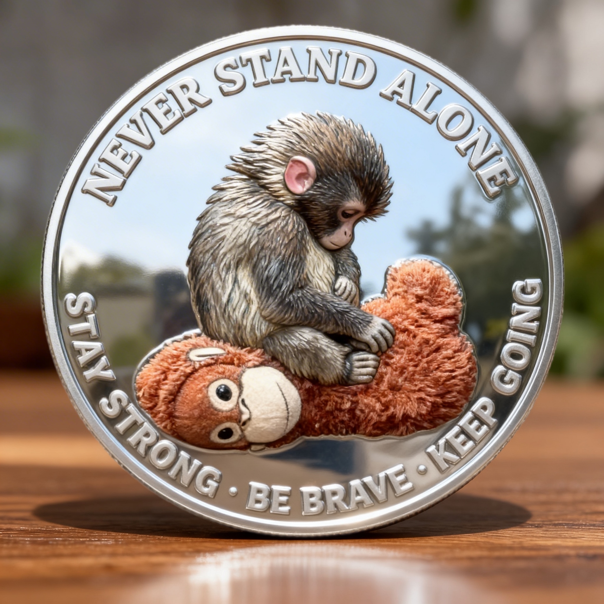 Beautifully crafted with detailed engraved relief artwork, this commemorative coin captures a tender moment between a small monkey and its beloved plush companion. The design represents support, protection, courage, and unconditional love—a message that resonates with people of all ages.