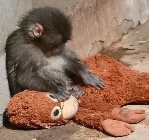 A young monkey gently holding its plush companion “Punch”