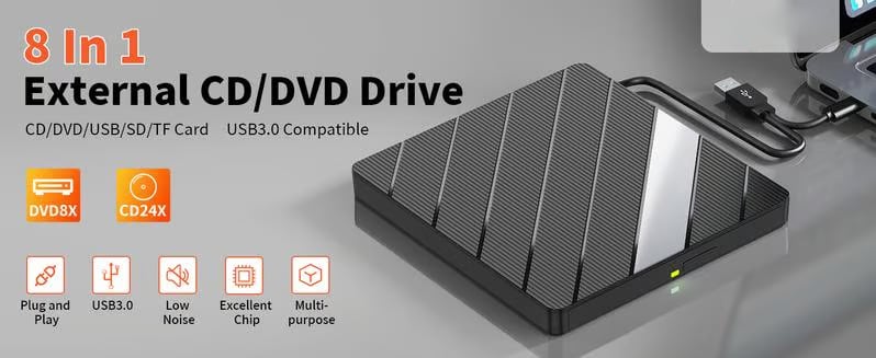 The External CD/DVD Drive for Laptop is a all-in-one solution for CD/DVD burning, data transfer, and multi-device connectivity. Whether you’re a student, professional, or creative, this USB 3.0 portable DVD player delivers 5Gbps high-speed transfers, backward compatibility, and plug-and-play simplicity.